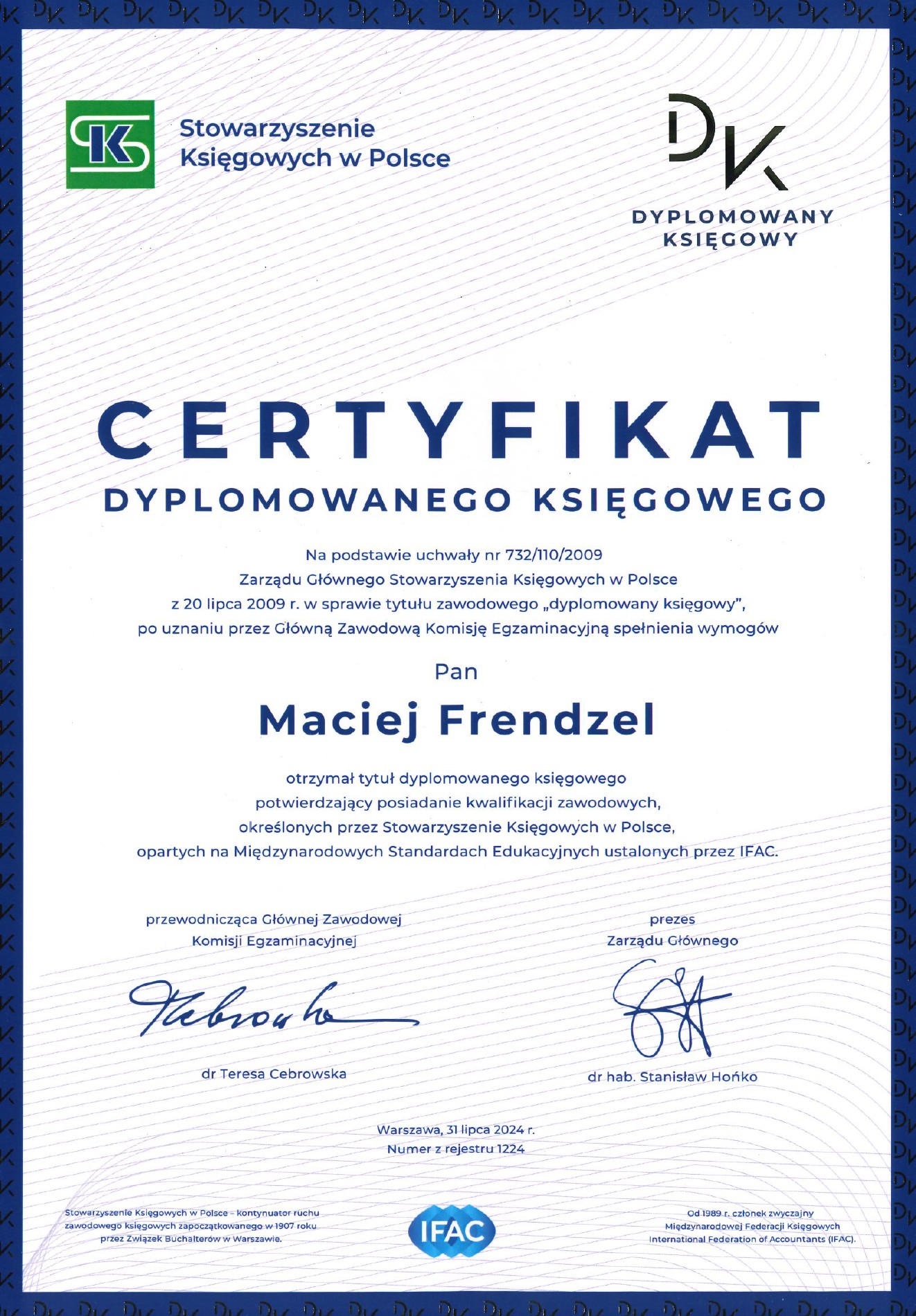 Z wielką radością informujemy, że dr Maciej Frendzel pomyślnie uzyskał certyfikat Dyplomowanego Księgowego, potwierdzający wysokie kompetencje zawodowe określone przez Stowarzyszenie Księgowych w Polsce.